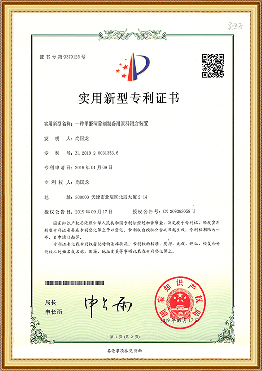實用新型專利證書(一種甲醛清除劑的原料存儲